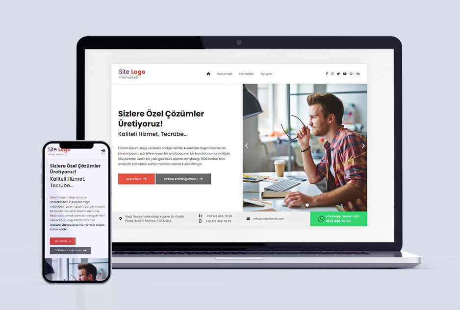 Sade tasarım ile hazırlanmış minimalweb ile firmanıza ait tanıtım web sitesine sahip olabilirsiniz. Firmanız hakkında iletişim, kurumsal ve hizmet alanları gibi bilgilerinizi tanıtabilirsiniz.